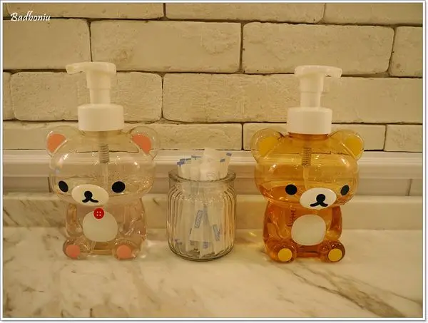 洗手乳也是拉拉熊罐子,廁所裡還有免治馬桶,也有提供尿布檯喔!
