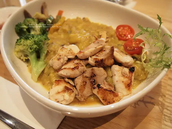 南瓜燉飯上的炭烤雞肉處理得好 焦香且軟嫩多汁
