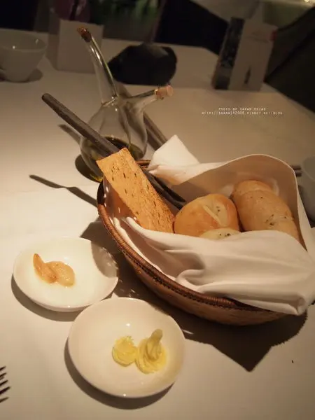 麵包可以搭配三種沾料-橄欖油+巴薩米可醋 奶油 醃漬大蒜