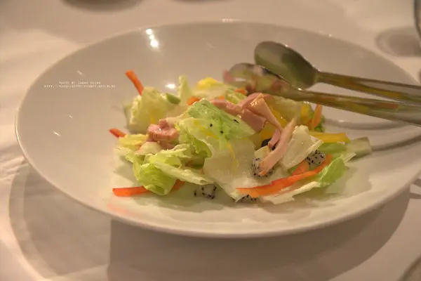 一旁有簡單調味的油醋生菜 番茄及燻鮭魚