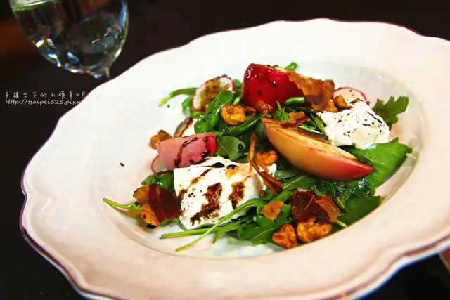 以核桃、熟成冷肉及水蜜桃和布拉塔起司做搭配,再淋上松露油醋醬