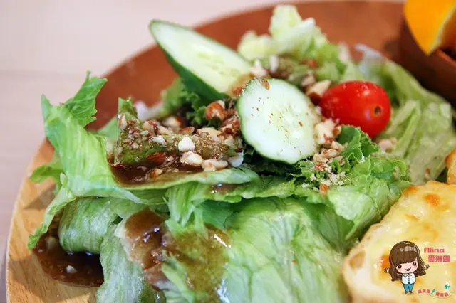 新鮮的生菜淋上少許油醋醬跟堅果顆粒