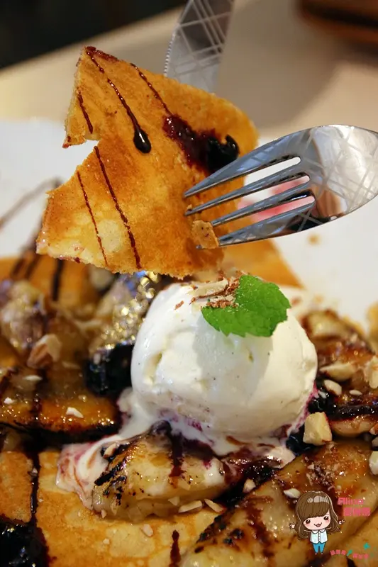 趕進在中間香草冰淇淋融化之前,切下蕎麥可麗餅沾取食用