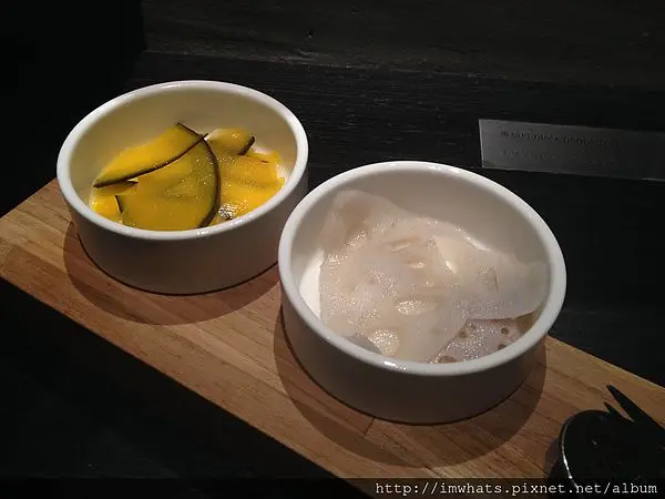 小菜是醃漬南瓜和蓮藕,蓮藕還保有脆脆的口感,酸酸得很開胃,是很不錯的小菜。