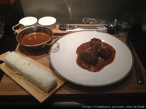 很花俏的擺盤~我的咖哩牛。牛是牛頰肉,白飯很三八的還整成長方形~將白飯分批放入盤子佐著咖哩與牛頰肉食用,感覺還挺優雅的。