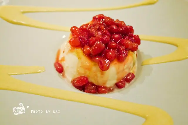 奶酪上鋪上紅豆,再沾上抹茶醬