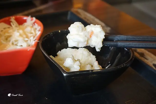 馬鈴薯沙拉口感上甜甜的且滿綿密的。