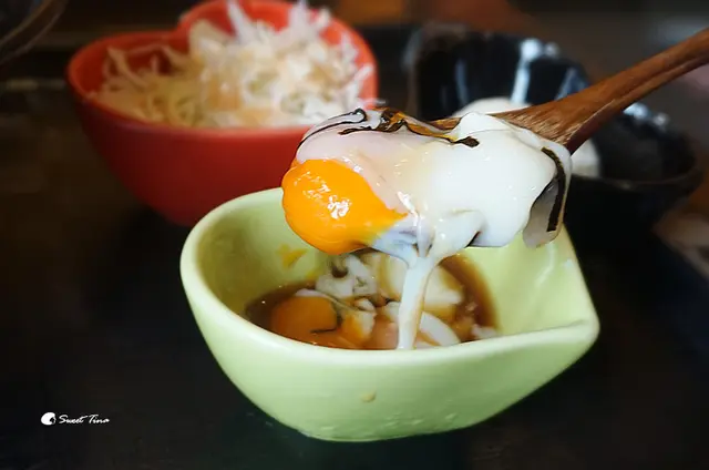 好愛這月見溫泉蛋啊,筷子輕輕一劃,裡頭的蛋黃就流出來了,與店家自製的醬汁非常合拍,不僅可口,也沒有任何腥味。