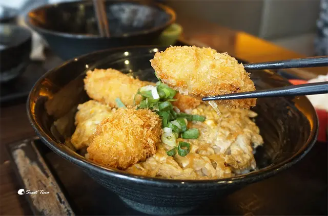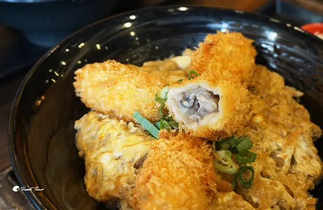上頭是四大塊炸牡蠣,底下是舖上熟蛋的丼飯。