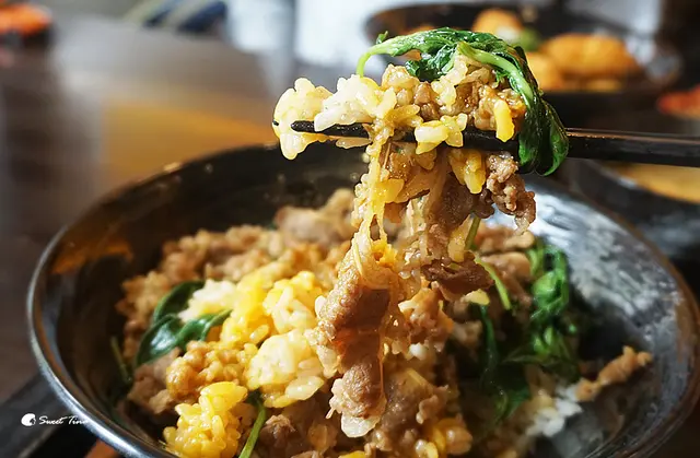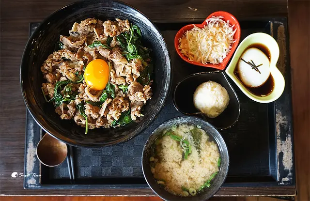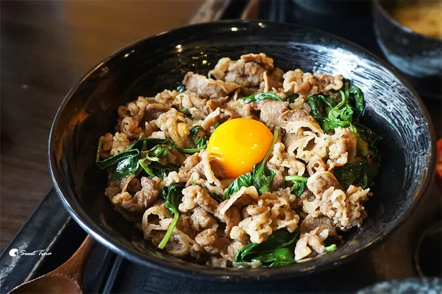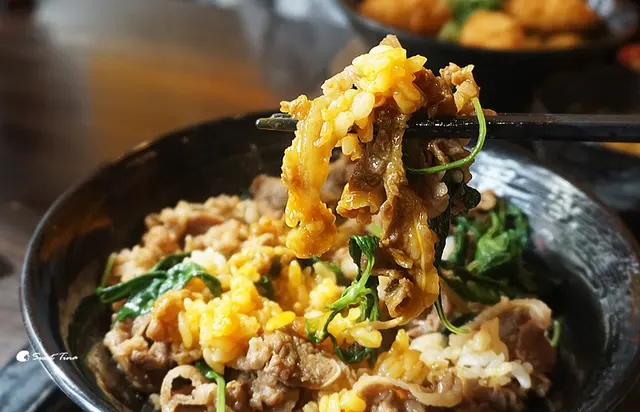 結合台式的九層塔與日式的牛肉丼飯,很創新的搭配,但也非常對味,如果不吃牛肉及生蛋的朋友,可以換成豬肉及熟蛋,但這裡的生蛋真的很棒,值得品嚐。