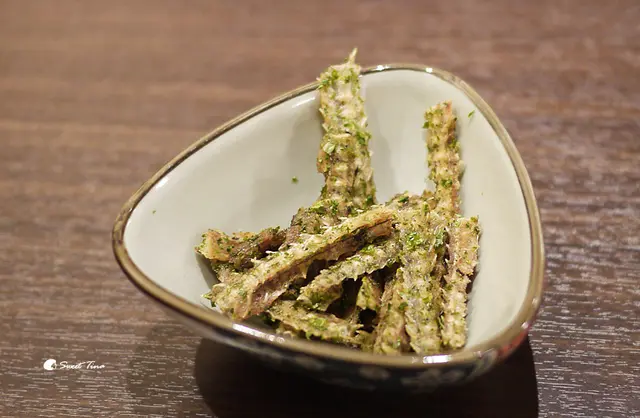 店家皆會附上餐前小點,會隨食材做變化,這天Tina享用的是魚骨頭,酥酥脆脆還挺香的。