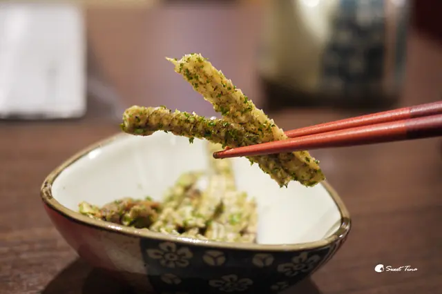 水蓮裹上新鮮蝦粉再與櫻花蝦一同油炸,口感酥脆、香氣四溢,很不一樣的炸水蓮,還挺喜歡的。