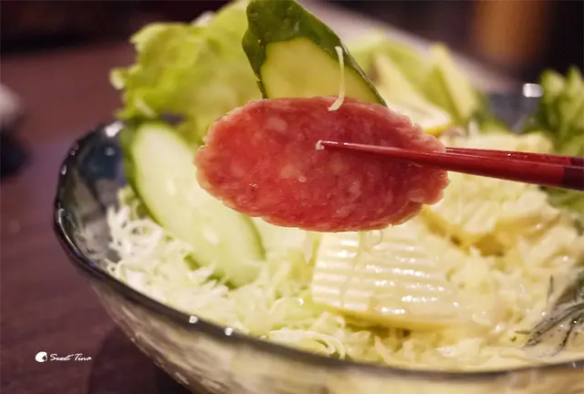 生野菜 - 份量還不小的生菜沙拉,有小黃瓜、蕃茄、玉米筍、高麗菜絲、蘿蔔絲、起司片、火腿,醬料以油醋醬為基底,覆蓋一些美乃滋,可以隨自己喜好搭配,上頭的小黃瓜不僅展現了師父的刀工,吃下後更是意外的順口,比單吃整片的小黃瓜更有口感,一整條一下子就被我嗑掉XD。