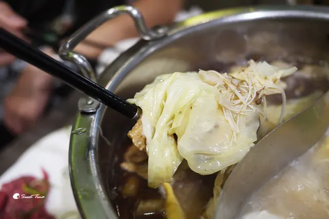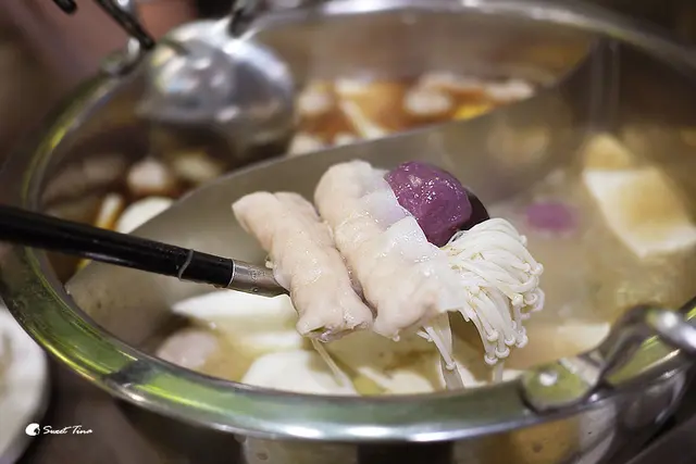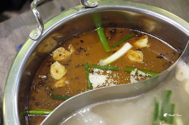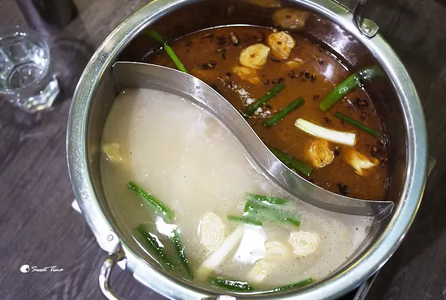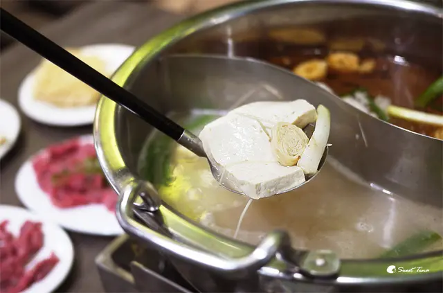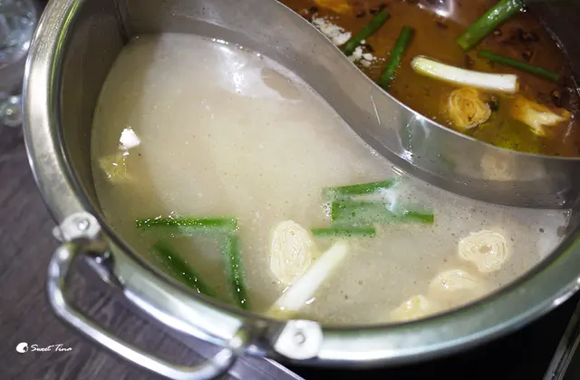 如果是二鍋的話,店家會以鴛鴦鍋的方式區隔,這天我們的鍋底選擇了天然大骨鍋(左)、薑母麻油鍋(右),煮的時候可以再加湯,但只提供加大骨湯,我們加了一次,濃郁的薑母麻油煮在加入大骨湯後也挺剛好的。