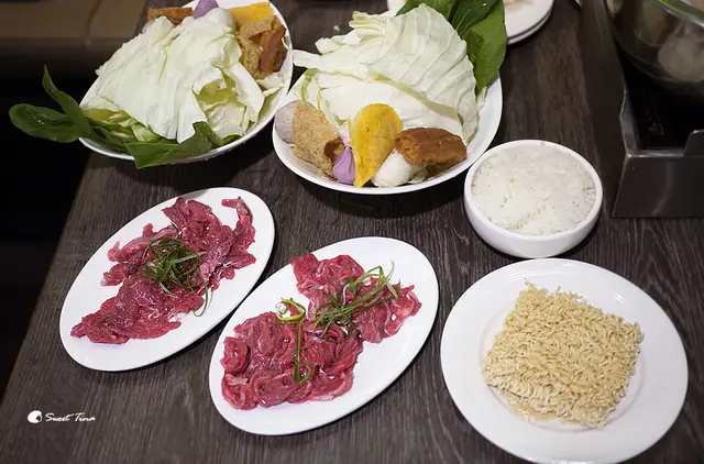 個人火鍋套餐除了鍋底,搭配的菜盤、飯或麵、牛肉盤,是看似不多,吃完可是會有飽足感的。