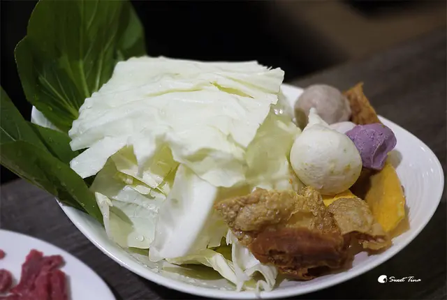 菜盤裡有青江菜、高麗菜、豆皮、油條、蛋餃、魚包蛋、魚餃、山藥球、貢丸各1,一人份的搭配挺剛好的。