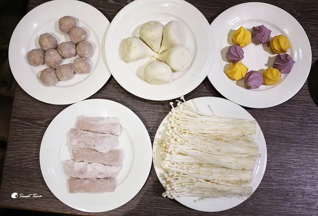 另外我們再選了五樣火鍋料搭配,有鴨肉貢丸、魚包蛋、綜合山藥球、燕餃、金針菇,加入後就飽得不要不要的~