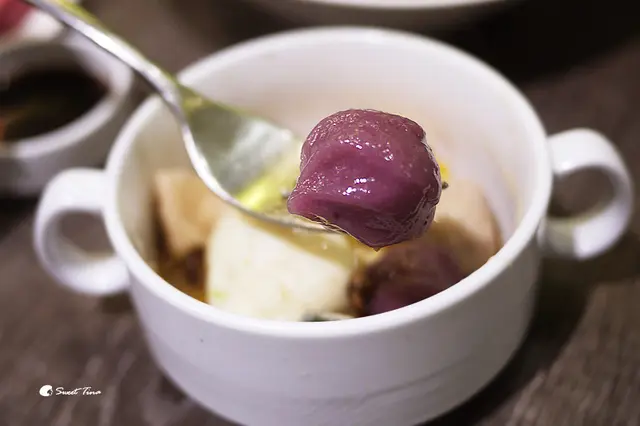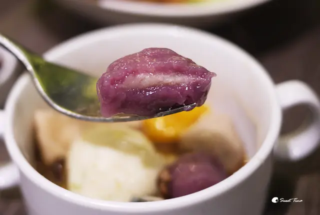 山藥球還是我第一次吃過耶,整個超弱的,所以還滿好奇什麼口感,外面像QQ的芋圓,咬下後可以吃得到山藥內餡,瑋兒也超喜歡的,一個人就吃了超多顆的。