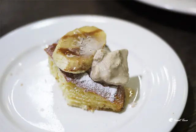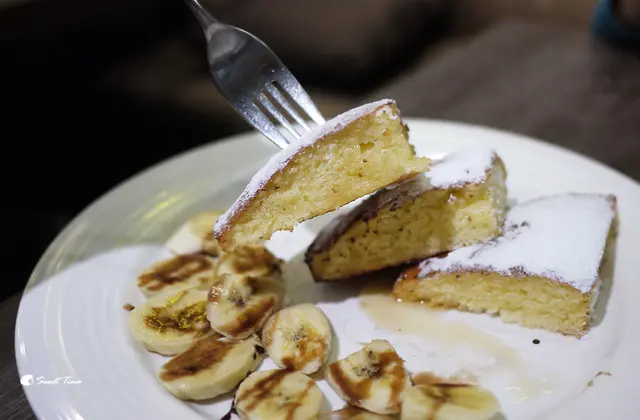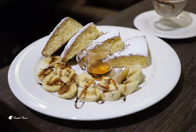 香蕉厚鬆餅佐手工奶茶冰淇淋 - 這份鬆餅還不小,可以同時享用到手工奶茶冰淇淋、厚鬆餅、香蕉,在餐後來上一份可以慢慢閒聊一番。