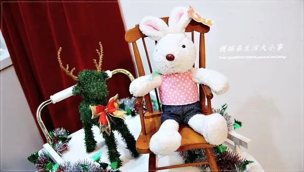 吧檯一旁有一隻大兔子娃娃跟馬卡龍