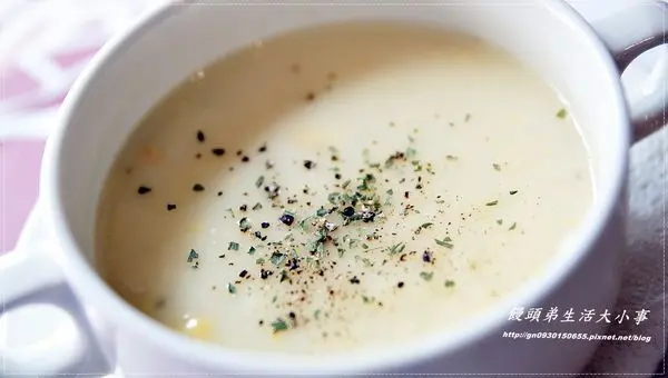 撲克雞塊茄汁肉醬麵附的玉米濃湯。喝起來口感還不錯