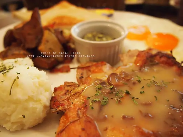 嫩煎雞腿佐奶油蘑菇醬、現炒薯塊、奶油洋菇、有機雞蛋、吐司&飲料