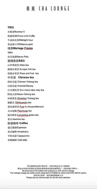 2017年7月3日起,茶苑下午茶改變原本的buffet模式,改以精緻的三盤鹹甜點,搭配12選2的花茶,雙人套餐價NT$.1480+10%,讓人吃得巧也吃得飽。法籍甜點主廚博豊安(Julien Perrinet)率領廚藝團隊,由依循自然時令與季節食材所推出的三層精緻法式鹹甜小點、近廿種中西式飲品,伴隨桌邊服務的現烤小點與悠揚鋼琴樂演奏,在洋溢古典風情的用餐環境下,享受慵懶愜意的午後時光。