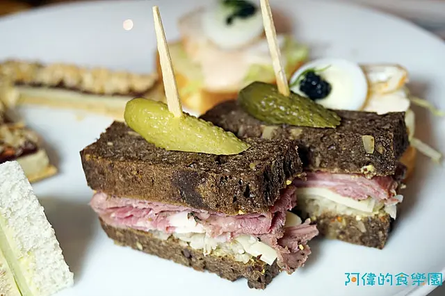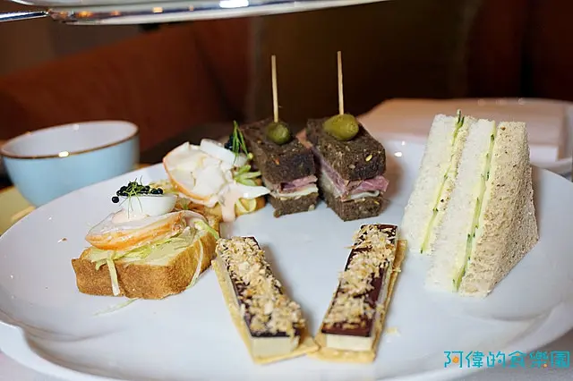 下層自製鹹點除了經典黃瓜三明治佐法國奶油帶來的清爽與滑順以外,也有酸香中帶有微微辛香的德式麵包佐胡椒牛肉與乳酪酸黃瓜、口感濃郁的奶油土司佐龍蝦與魚子醬,以及齒頰留香的波特葡萄酒鴨肝凍佐焦糖榛果等少見的下午茶點心式樣。