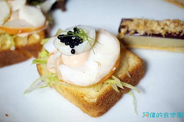 小巧的吐司上有龍蝦魚子醬及水煮蛋,新鮮又美味,些許的生菜絲具有解膩的效果。