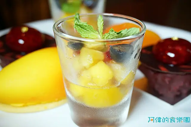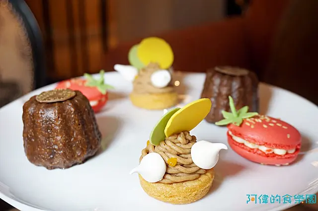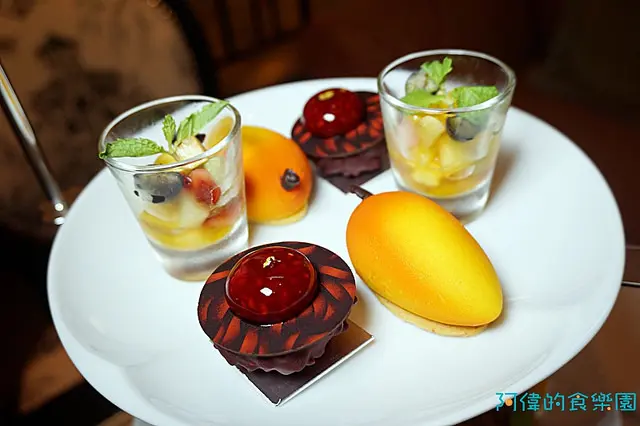 中層精緻甜點部份,除獻上模樣討喜可愛,外殼微酥內部鬆軟,具有「天使之鈴」美稱,外表香酥內層綿密的經典法式點心可麗露之外,亦有以栗子泥與芒果醬為主角的法國經典甜品蒙布朗,不僅口感優雅,更具體而微地呈現出白朗峰巍峨的氣勢,與甜中略帶酸香的細緻口感變化。伴隨一旁色彩繽紛,選用時令鮮果製成,口感清新酸甜的水果沙拉,更增加視覺與味覺的雙重愉悅。