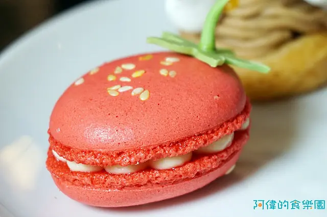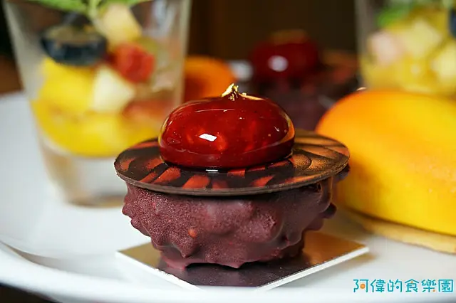 最特別的是頂端紅色的球一咬會爆漿,裡面是玫瑰覆盆子醬,酸酸甜甜的,配下方微苦的巧克力,很厲害