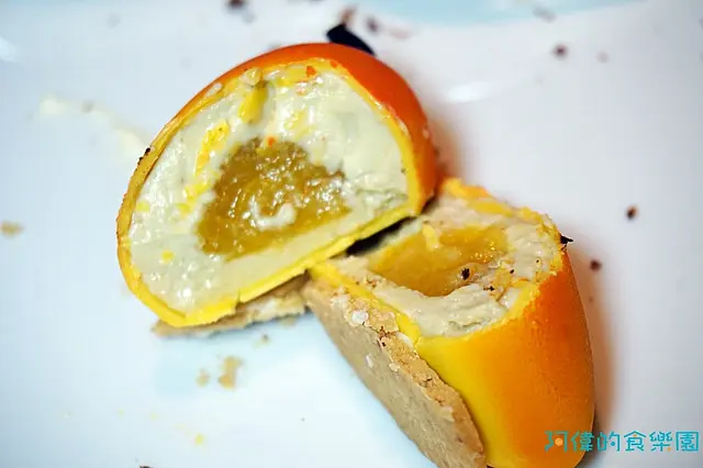外皮是白巧克力染色,內餡好好吃,中心是芒果果醬,白色是茉莉花茶慕斯,口感帶著茉香,清甜好吃。