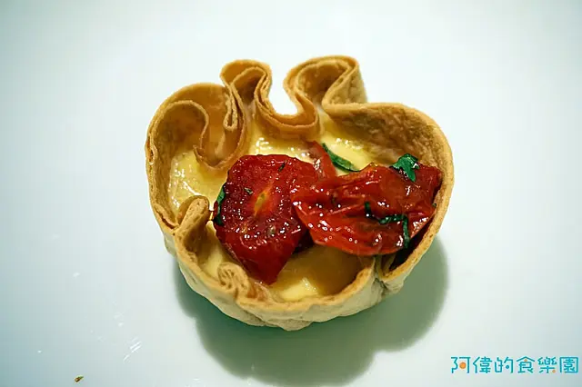 這款的品名是「乳酪鹹派」,它上桌的時候還溫熱的。中心是類似蒸蛋的起司配上番茄乾,屬於鹹的點心,蠻好吃的。
