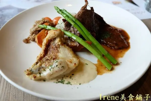 我記得是魚跟牛排的組合餐,基本是搭配兩球白飯~