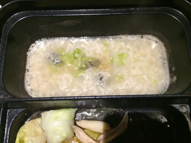 最後將湯裡的材料全都撈出來,下白飯進湯裡炊煮,滾起的時候再加入鮮蚵跟芹菜末