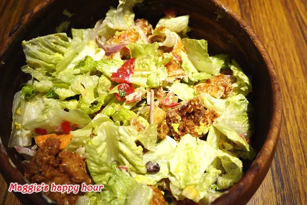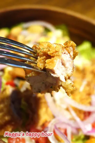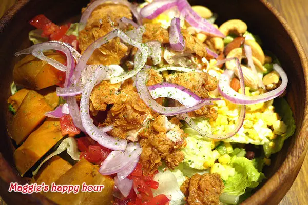 「德州雞肉百匯沙拉」佐塔塔醬,用木盆裝的沙拉份量超級驚人,裡面除了表面看得到的炸雞肉塊外,還有許多的料像是生菜、玉米、蕃茄、紅洋蔥、雞蛋、地瓜、紅豆和堅果等等,食材很新鮮。