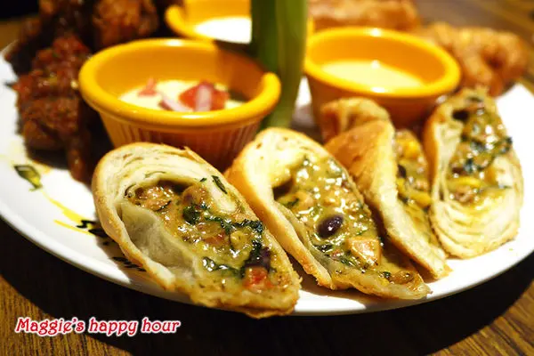 開胃菜「綜合拼盤」有起司條、雞翅、墨西哥雞肉捲和香酥雞柳條可選,後來我們選了後三者來搭配,每一種我都很想吃。送上來除了上述幾樣開胃菜外,中間還搭配了西洋芹和三種沾醬,上頭有蕃茄丁的是酪梨香椿醬,順時針往上走是蜂蜜芥末醬和藍莓起司醬,服務人員有介紹了一下什麼醬搭配什麼菜,不過一眼望去我們點的三樣開胃菜味道都很夠了,反而不太需要沾醬就可以吃了,反倒是沾西洋芹吃三種味道的沾醬都蠻對味的。