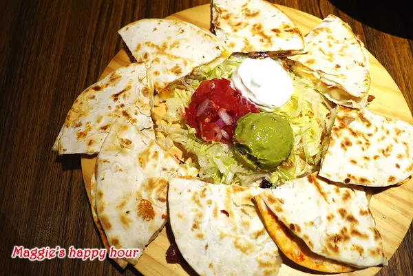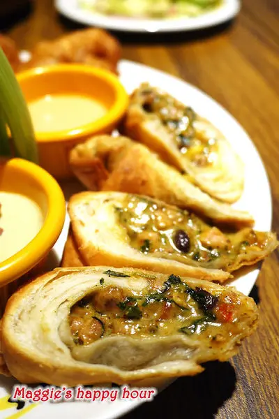 墨西哥雞肉捲是裡面味道最重的,它頗有辣度,裡面除了雞肉丁外還有菇類和玉米,加上外層的餅皮酥軟又散發淡淡麥香,在口中咀嚼出多層次的口感和味道的變化,是我最愛的一道開胃小點,感覺好像吃到這裡就可以很滿足的擦嘴回家了,因為己經很飽了啊!