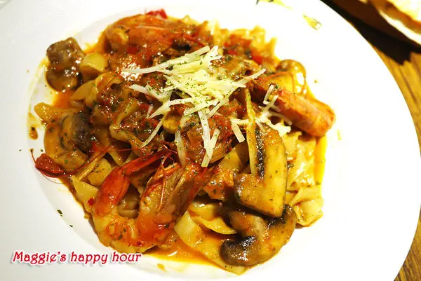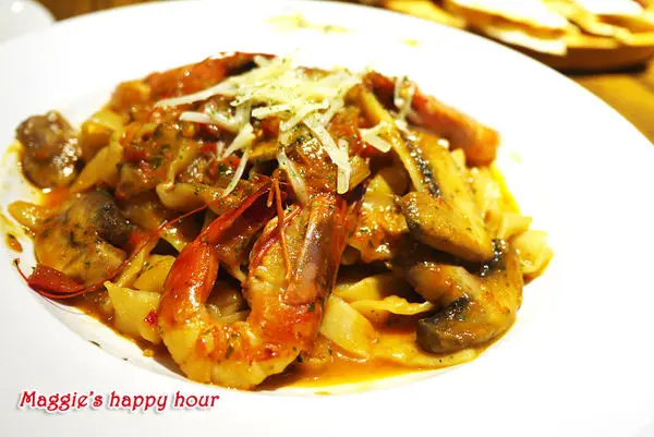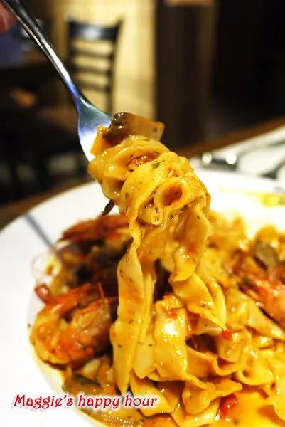 「香辣紅椒醬鮮蝦寬捲麵」裡面放了菇類、蕃茄、洋蔥等配料加上起司絲,蝦子用的是草蝦並貼心撥除蝦身的殼和腸泥,不過這蝦子吃起來有股讓我用筆墨難以形容的味道,和一般印象中吃到的蝦子很不同,可能是冷凍蝦的關係,和一般新鮮的蝦子在肉質和口感上都有差異。