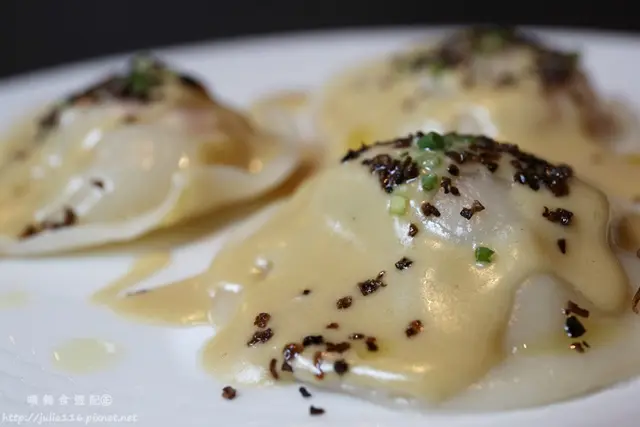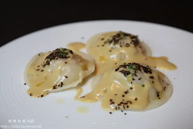 本港直送甜蝦松露義大利餃佐鴨肝天鵝絨醬汁$420