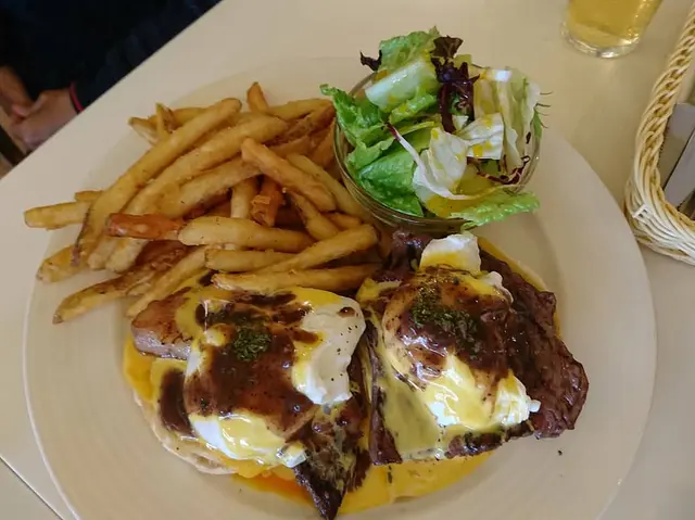 「牛小排班尼迪克蛋」一班的班尼迪克蛋都小小份,旅人咖啡的讓人有全新印象的,牛小排不柴,配上荷蘭醬滋味豐富。