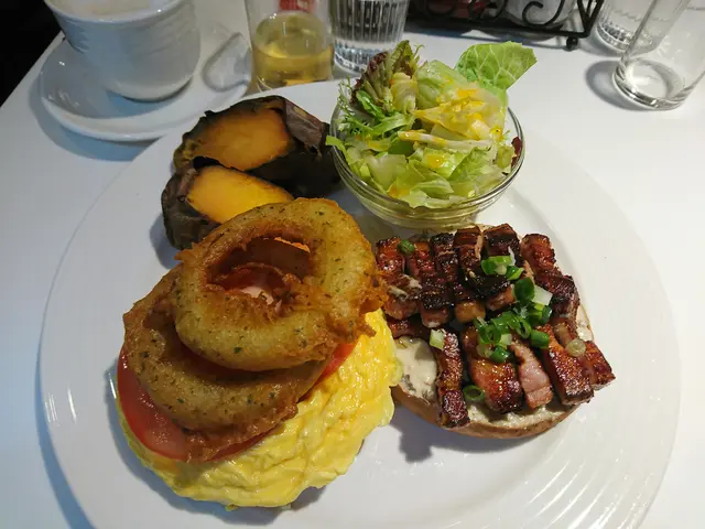 這有洋蔥圈、烤地瓜、蔥煎豬肉。