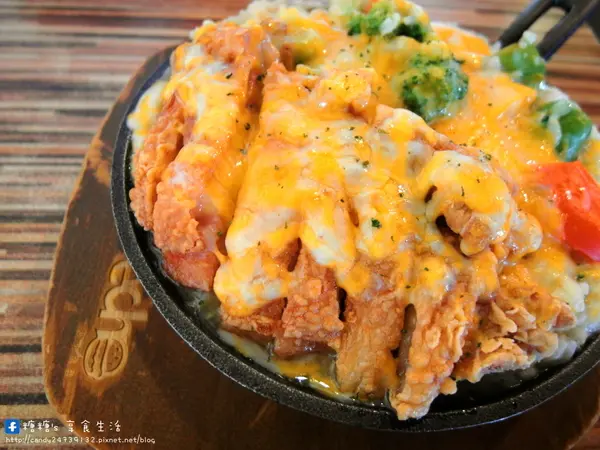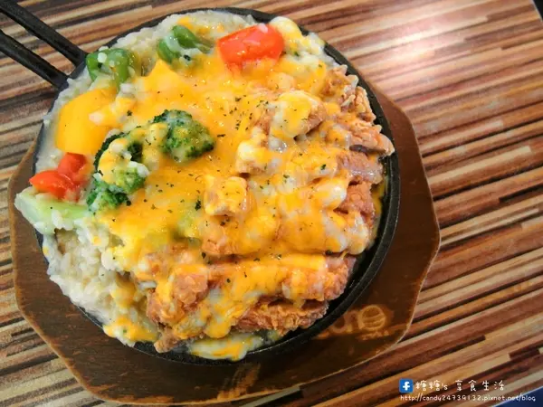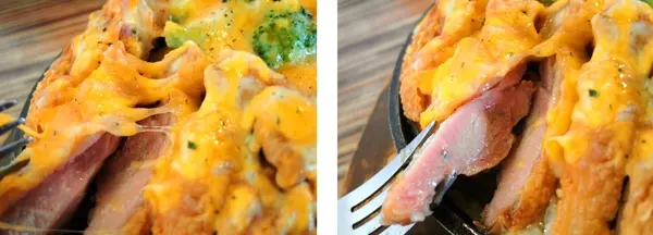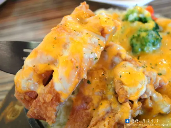 雞腿排有先醃過,再下鍋油炸至今黃酥脆,肉質軟嫩多汁,因上面有鋪上一層焗烤起司