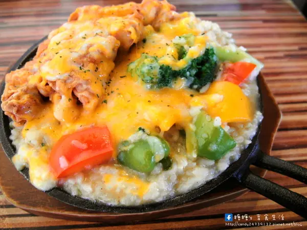 上頭鋪上濃郁的起司下去焗烤,除了主角雞腿排外,還有甜椒、青椒及花椰菜