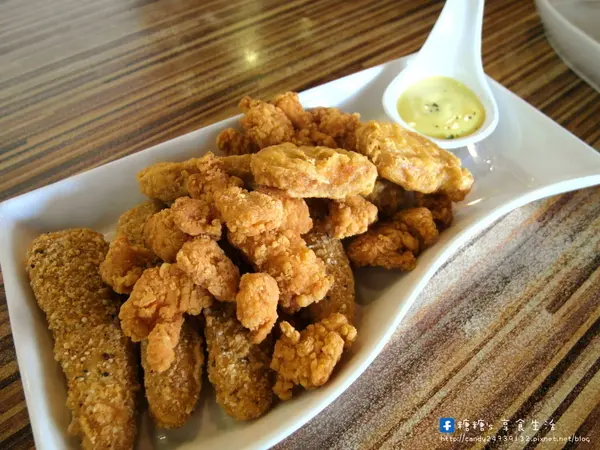 這盤拼盤裡有辣味雞米花、雞柳條及雞塊三種,一旁還有附上蜂蜜芥茉醬,可搭配食用