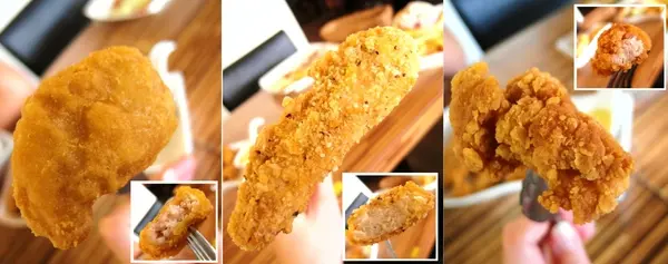 雞塊外皮香脆,肉質軟嫩,咬下去還會噴汁出來呢,三個裡面糖糖最愛雞塊這款
