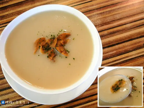 這次品嘗到的是菌菇濃湯,湯頭濃郁,上頭加了炸過的蒜片來提味