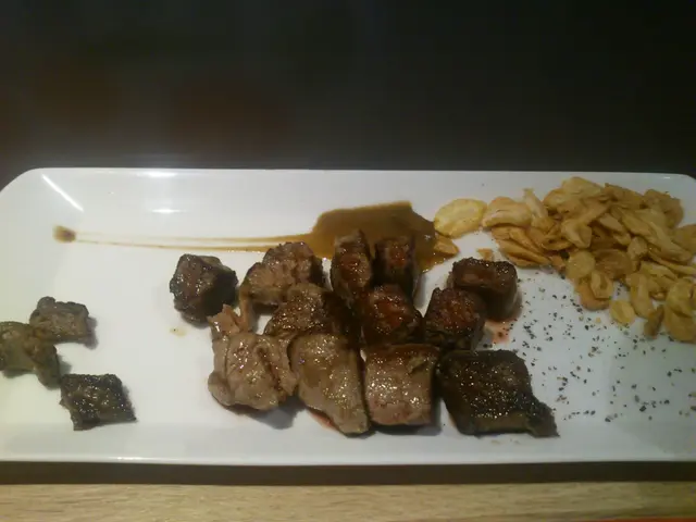 我的香蒜炙燒牛排及朋友的照燒黃金雞腿,我的牛排有點太早上後來有點冷掉,不過旁邊的香蒜炸的有酥脆,牛肉口感也不錯,左邊三小塊上菜的時候有說是帶筋的部份會很有嚼勁