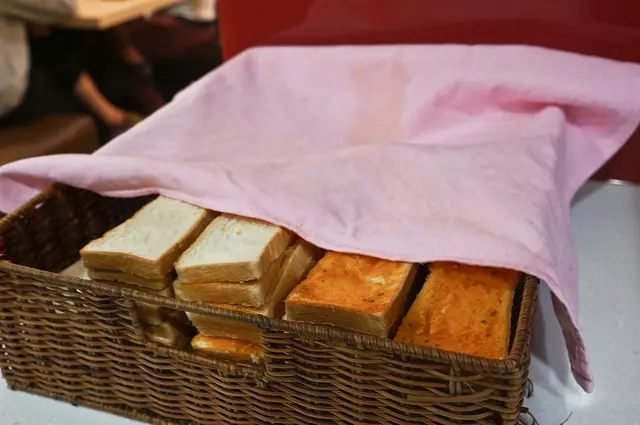 麵包是放在麵包籃裡面, 貼心的用塊布包著, 這樣作法我比較喜歡, 有些店會放在抽屜裡, 但那樣作的話其實我總覺得那裡不太好