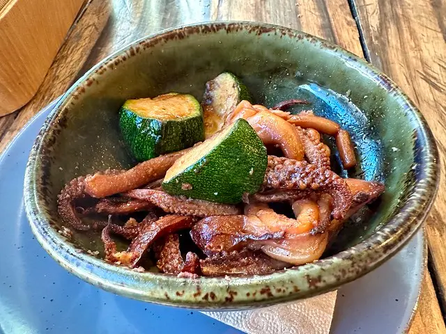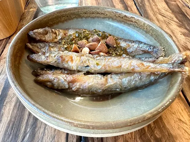 amy這天給自己點了花椒油漬柳葉魚、香煎紅油小卷和煎烤二層肉佐青豆泥。